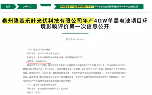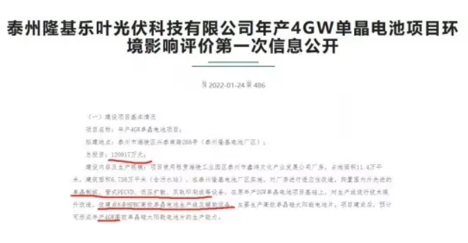 1月24日,隆基股份旗下泰州隆基樂葉光伏科技有限公司年產(chǎn)4GW單晶電池項(xiàng)目環(huán)評(píng)信息披露。根據(jù)公開信息,隆基計(jì)劃在泰州隆基電池廠內(nèi),在原年產(chǎn)2GW單晶電池項(xiàng)目的基礎(chǔ)上對(duì)生產(chǎn)線進(jìn)行技術(shù)提升改造,改建成8條HPBC高效單晶電池產(chǎn)線,預(yù)計(jì)形成年產(chǎn)4GW的電池片產(chǎn)線。