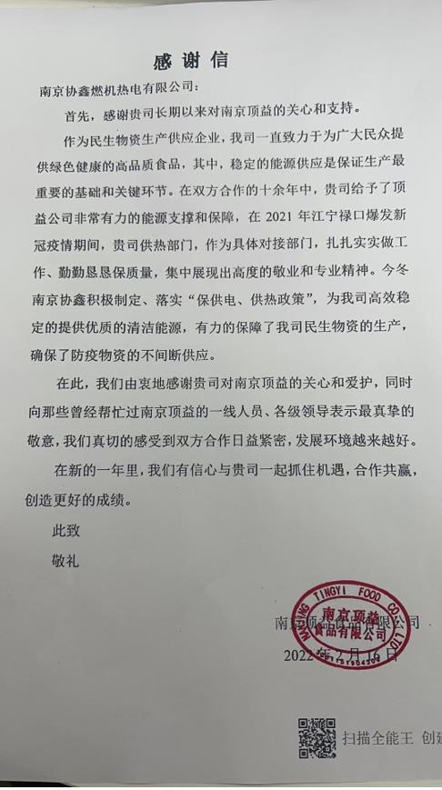 圖2:南京頂益食品有限公司給協鑫南京熱電發來感謝信