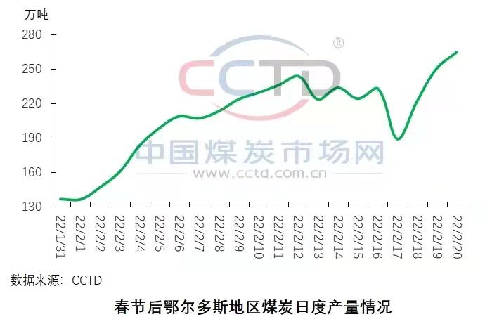 產地煤炭供應穩步增加。近期,產地煤礦復工復產進程加快,在產煤礦產量逐步增加,根據CCTD中國煤炭市場網監測的數據顯示,截至目前,鄂爾多斯地區在產煤礦數量已提升至225座,較春節期間增加42座,區域內煤炭日產量已超過260萬噸/日,較春節期間最低點增長超90%。
