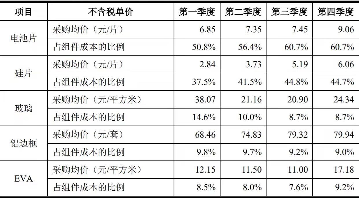 運(yùn)費(fèi)高位運(yùn)行、高硅料價(jià)格抑制的組件需求及2021年全年低價(jià)組件的擾動(dòng)、開(kāi)工率不足導(dǎo)致的成本上行等因素。