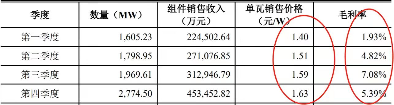 組件來(lái)看,東方日升(同時(shí)也包括了隆基在內(nèi)的大部分光伏組件企業(yè))第四季度組件價(jià)格才1.63元,大幅跑輸上游,特別是第四季度。固然有低價(jià)訂單的作用,但日升回復(fù)函表示2022年1月銷售的均價(jià)達(dá)到了1.8,而在最新披露的報(bào)告里有人透露組件價(jià)格成交價(jià)格達(dá)到了1.9左右,而成本方面則和去年四季度差不多。