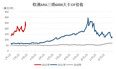 盡管沒有實施與能源相關的制裁,但是這仍然給歐洲公用事業公司帶來了許多問題。多年以來,俄羅斯是歐洲和地中海區域的主要能源供應國,俄羅斯煤低硫優質,而且通過波羅的海碼頭運輸比其他貨源的運輸速度更快,在歐洲動力煤消費中占比很大。目前,全球能源和大宗商品市場的不確定性推高了這些地區的動力煤價格,買家對于是否購買俄羅斯貨物舉棋不定。本周普氏評估6000大卡CIF現貨價達到260美元/噸的峰值,這是自去年10月以來的最高水平。上周五價格有所降溫,但仍然在200美元/噸以上的水平。