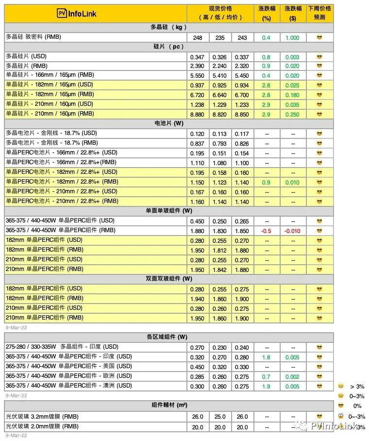3月9日,PVInfoLink發(fā)布光伏產(chǎn)業(yè)鏈最新周價(jià)格匯總,上游硅料、硅片環(huán)節(jié)價(jià)格再次上漲。