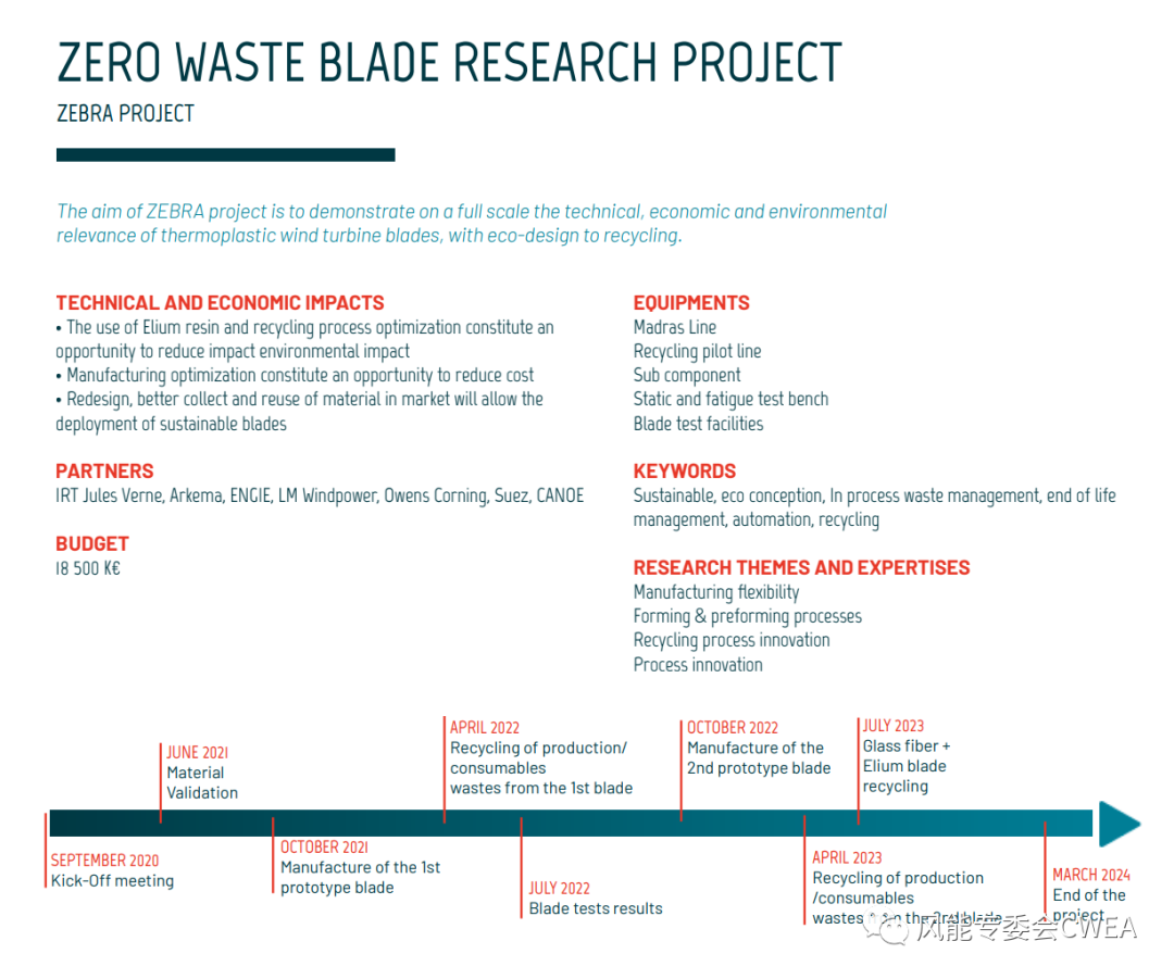 ZEBRA零廢葉片研究項目于 2020 年 9 月正式啟動,由法國凡爾納國際研究中心(IRT Jules Verne)領導發起,這家獨特的合作伙伴組織匯集了包括阿科瑪、CANOE、Engie、LM Wind Power、歐文斯科寧和 SUEZ 在內的多家工業公司。項目預算超過1850萬歐元。