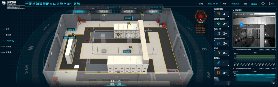 使用數(shù)字孿生技術以立體三維方式展示站房的不同區(qū)域溫濕度、火災煙霧告警、燈控、視頻和其它預設位信息等,全方位直觀展示站房的運行環(huán)境,監(jiān)測信息一目了然。