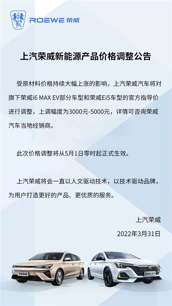 3月31日,榮威品牌官方宣布:受原材料價(jià)格持續(xù)大幅上漲的影響,上汽榮威汽車將于5月1日零時(shí)起,對旗下榮威i6 MAX EV部分車型和榮威Ei5車型的官方指導(dǎo)價(jià)進(jìn)行調(diào)整,價(jià)格上調(diào)3000-5000元。