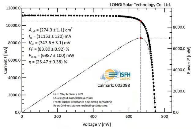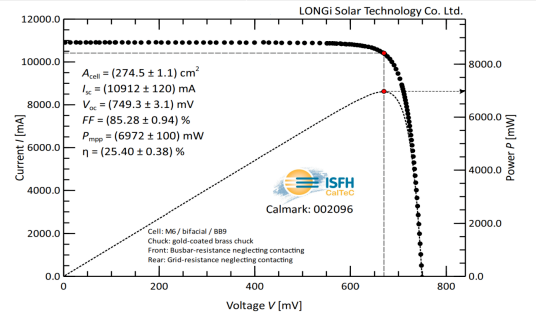 3月29日,經德國哈梅林太陽能研究所(ISFH)認證,隆基采用摻鎵p型硅片制備的硅異質結電池(p-HJT)獲得效率新突破:完全利用可量產工藝在全尺寸(M6尺寸,面積274.3cm)單晶硅片上,創(chuàng)造了轉換效率為25.47%的大尺寸p型光伏電池效率世界紀錄,進一步驗證了低成本異質結量產技術的可行性。