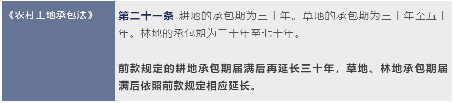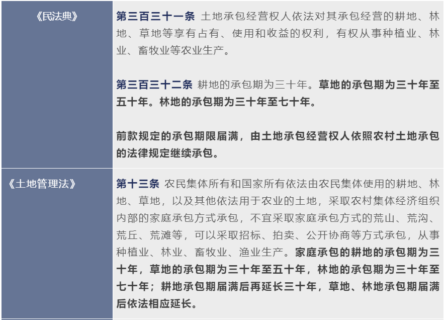第二輪土地承包即將到期,《民法典》《土地管理法》和《農(nóng)村土地承包法》均對(duì)土地承包續(xù)期問(wèn)題作出了規(guī)定,具體情況如下表: