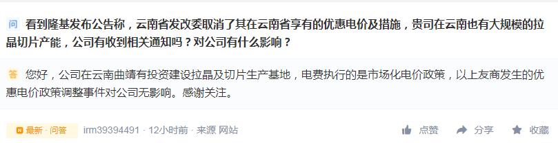 中環(huán)股份在接受媒體采訪(fǎng)時(shí)表示,云南取消隆基優(yōu)惠電價(jià)對(duì)公司沒(méi)有什么影響;而通威股份在接受媒體提問(wèn)時(shí)則回應(yīng)稱(chēng),“我們沒(méi)有收到相關(guān)的通知”。