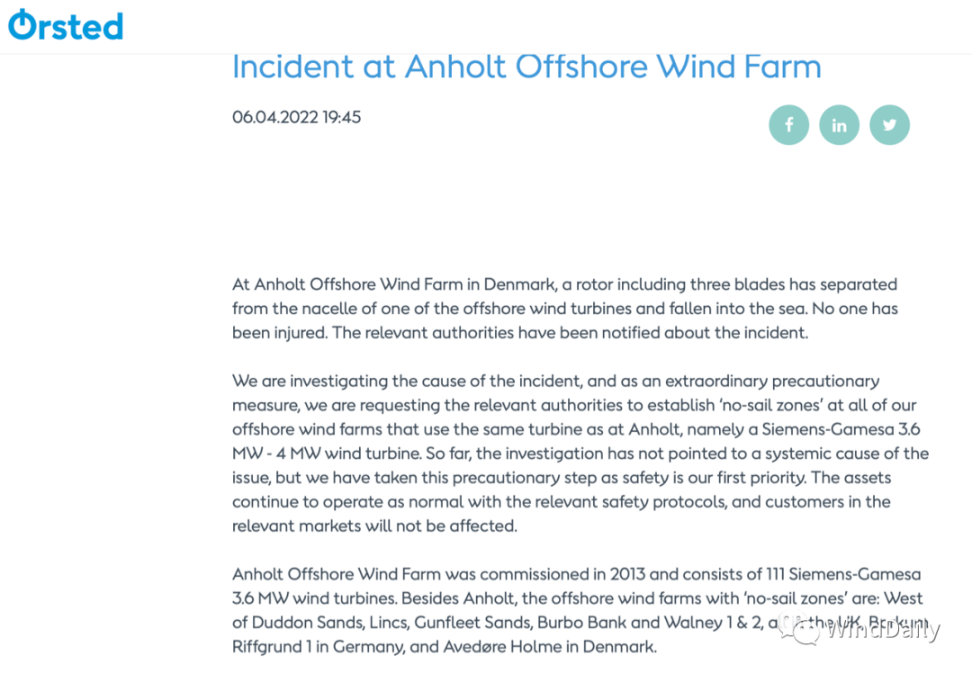 事關(guān)安全無(wú)小事,再小的事故也足以警醒眾人。WindDaily獲悉,丹麥Anholt海上風(fēng)電場(chǎng)本周三發(fā)生一起風(fēng)電事故,三支葉片從從一臺(tái)風(fēng)電機(jī)艙分離并墜入大海。事故已通知相關(guān)當(dāng)局,所幸無(wú)人傷亡,事故根本原因尚未查明。