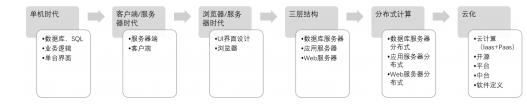 由賽迪CCID提供的分析表可以看出:由國(guó)內(nèi)單一公司全面替代SAS,在技術(shù)層面有一定難度,但隨著軟件開發(fā)技術(shù)架構(gòu)的演變,可由多家拆解開發(fā)、依托中臺(tái)技術(shù)云化實(shí)現(xiàn)SAS功能。如下圖所示:軟件開發(fā)技術(shù)架構(gòu)從單機(jī)時(shí)代發(fā)展到如今的分布式時(shí)代、云化時(shí)代,軟件定義“一切”,軟件業(yè)云化、平臺(tái)化、中臺(tái)技術(shù)、服務(wù)化發(fā)展趨勢(shì)凸顯,軟件產(chǎn)品和服務(wù)向基于云計(jì)算方向發(fā)展。