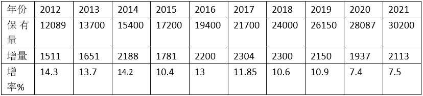 表1:表一2012-2021年我國(guó)汽車(chē)保有量(萬(wàn)輛)