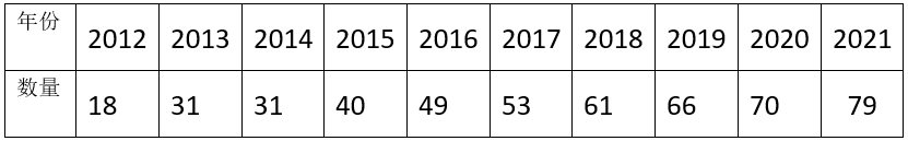 表二:2012-2021年汽車(chē)保有量上百萬(wàn)輛的城市數(shù)量(個(gè))
