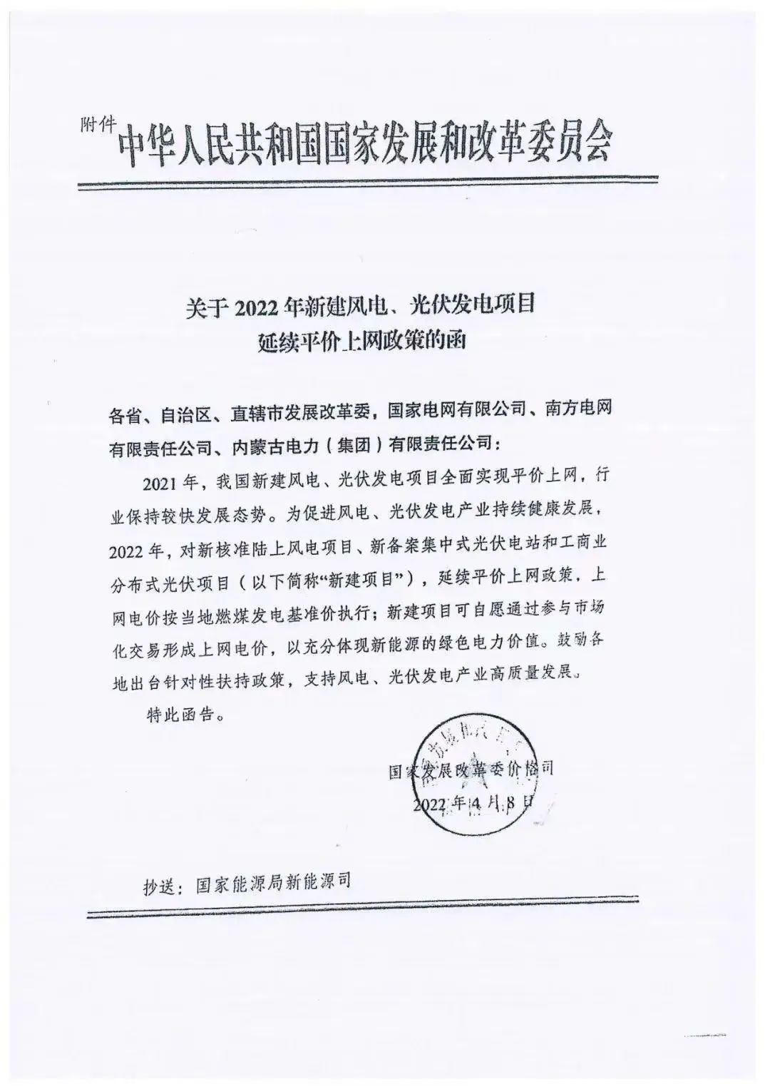 4月18日,科爾沁人民政府轉發由國家發改委發布的《關于2022年新建風電、光伏發電項目延續平價上網政策的函》的通知。