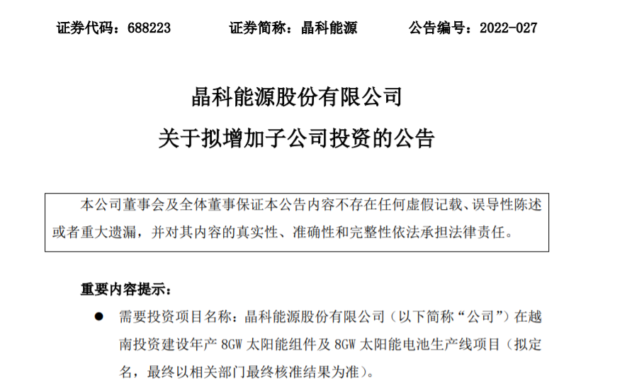 4月22日丨晶科能源(688223.SH)公布,為優(yōu)化公司全球制造產(chǎn)能布局,公司于2021年1月7日召開(kāi)第一屆董事會(huì)第三次會(huì)議審議通過(guò)了《關(guān)于對(duì)外投資設(shè)立子公司的議案》,同意公司通過(guò)全資子公司晶科能源香港有限公司(“晶科香港”)投資設(shè)立 JINKO SOLAR(VIETNAM) INDUSTRIES COMPANY LIMITED (“晶科越南實(shí)業(yè)”),計(jì)劃在越南總投資約49976萬(wàn)美元(以外匯匯率 6.7 計(jì)算),用于建設(shè)年產(chǎn)5GW高效電池和5GW高效電池組件生產(chǎn)線項(xiàng)目。