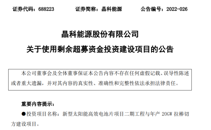 4月22日丨晶科能源(688223.SH)于2022年4月21日召開(kāi)公司第一屆董事會(huì)第十八次會(huì)議和第一屆監(jiān)事會(huì)第九次會(huì)議,審議通過(guò)了《關(guān)于使用剩余超募資金投資建設(shè)項(xiàng)目的議案》,同意公司使用剩余超募資金投資建設(shè)新型太陽(yáng)能高效電池片項(xiàng)目二期工程與年產(chǎn)20GW拉棒切方建設(shè)項(xiàng)目。