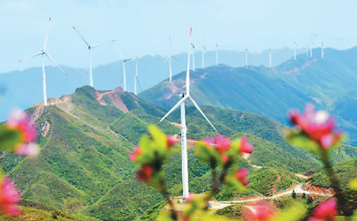 近年來(lái),江西省贛州市興國(guó)縣積極推進(jìn)綠色低碳減排工作,大力發(fā)展風(fēng)力發(fā)電等綠色產(chǎn)業(yè)。圖為4月20日,矗立在群山之中的興國(guó)縣茶園鄉(xiāng)十八排風(fēng)電場(chǎng)的發(fā)電機(jī)組。