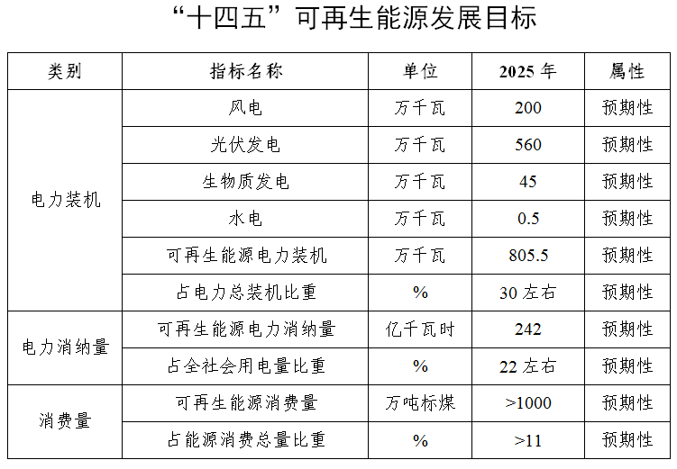 到2025年,全市投產可再生能源電力裝機超過800萬千瓦,占電力總裝機的比重達到30%左右,力爭開發建設規模達到1000萬千瓦;完成國家下達的可再生能源電力消納責任權重指標,可再生能源電力消納量占全社會用電量的比重達到22%左右;可再生能源消費量折合標煤超過1000萬噸,占能源消費總量的比重超過11%,力爭提高4個百分點以上。