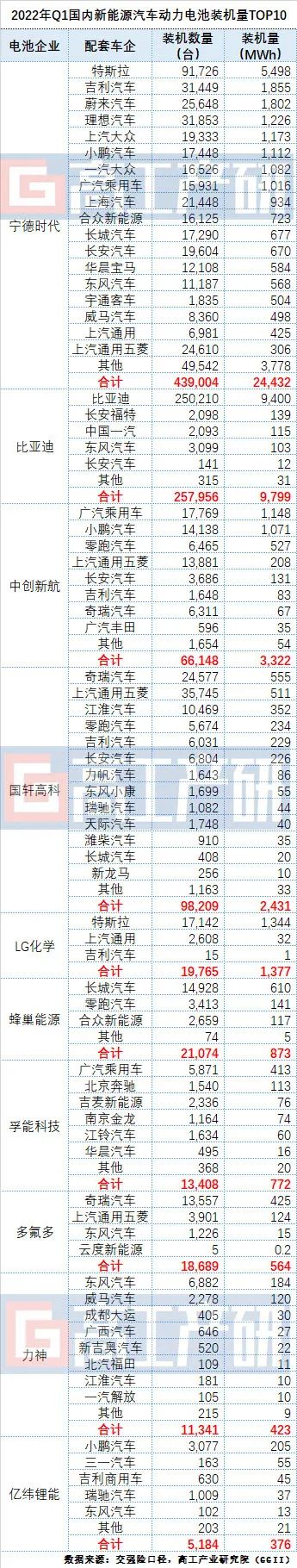 高工產(chǎn)業(yè)研究院(GGII)通過新能源汽車交強(qiáng)險(xiǎn)口徑數(shù)據(jù)統(tǒng)計(jì)顯示,2022年Q1我國新能源汽車?yán)塾?jì)銷售104.4萬輛,同比增長136%;動(dòng)力電池裝機(jī)量約46.87GWh,同比增長140%。其中,動(dòng)力電池裝機(jī)量排名前十企業(yè)合計(jì)約為44.37GWh,占總裝機(jī)量的95%。