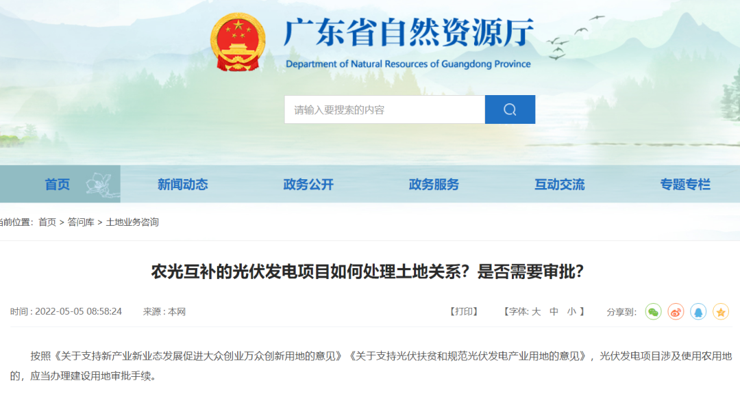 近日,廣東自然資源廳官網發布“農光互補的光伏發電項目如何處理土地關系?是否需要審批?”的問題回復。
