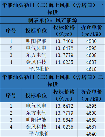項(xiàng)目分兩個(gè)標(biāo)段,共有金風(fēng)、明陽等4家整機(jī)商競標(biāo)。項(xiàng)目投標(biāo)最低折合單價(jià)4580元/kW。