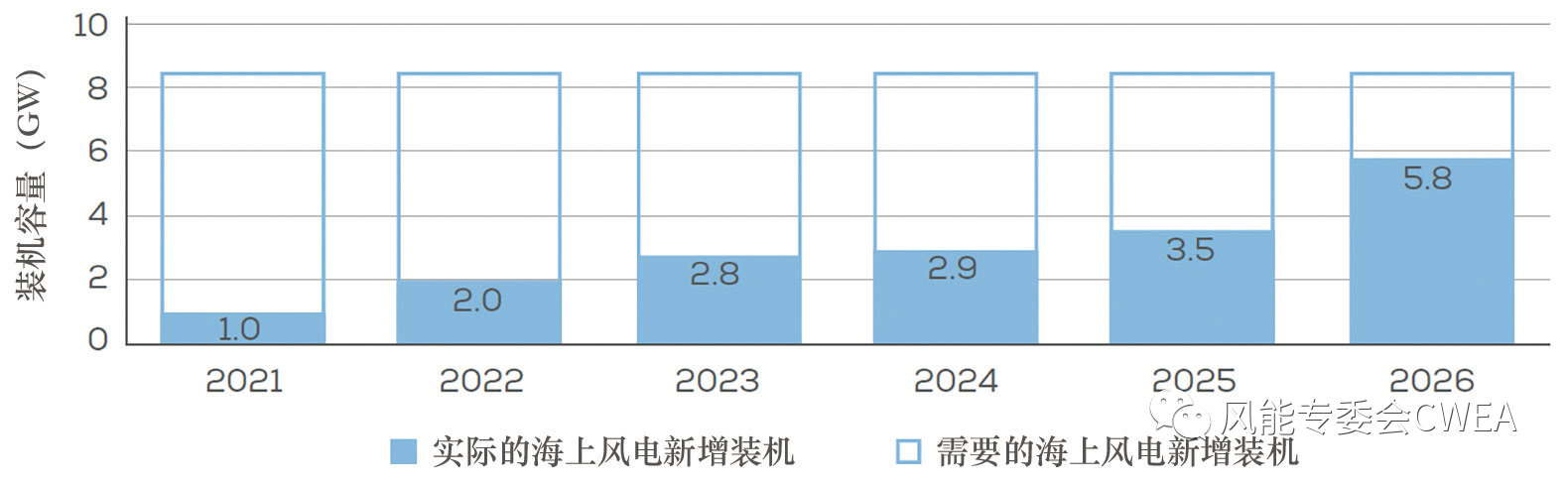 在現實預期情景下,預計歐洲在2022―2026年間海上風電將新增裝機27.9GW。這意味著年平均新增裝機量幾乎翻了一番,從3GW提高至5.6GW,占歐洲風電整體市場的24%。