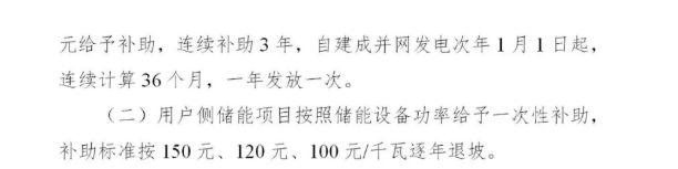 此外,對實施的光伏發電項目配建儲能系統并接受電網統籌調度的(經審批備案且年利用小時數不低于600小時),額外實行儲能容量補貼,補貼期自2021年起暫定3年,補償標準按200元、180元、170元/千瓦·年逐年退坡,已享受上級補助的項目不再重復補助。