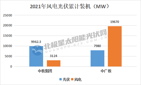 從中廣核和中核的風光版圖來看,二者光伏裝機較為相近而風電裝機差距較大。