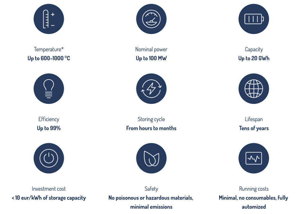 該公司在電視采訪中告訴記者,裝置的效率非常高。極夜能源首席技術(shù)官馬庫·伊洛寧(Markku Ylönen)說,“把電能轉(zhuǎn)化為熱能很容易”,但把熱能轉(zhuǎn)化為電能,需要汽輪機(jī)和更復(fù)雜的東西。如果只是用于供熱、采暖,非常簡(jiǎn)單。該公司聲稱裝置的效率因子高達(dá)99%,能以最低損耗持續(xù)儲(chǔ)熱數(shù)月,壽命長達(dá)幾十年。