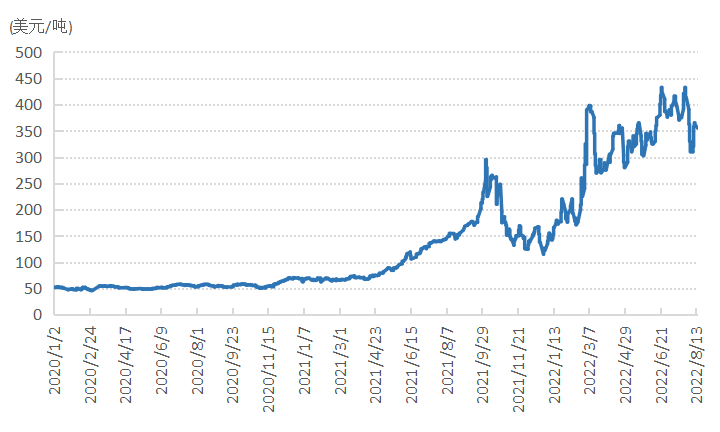 在宣布禁止俄煤后,為應對能源短缺局面,德國一邊加足馬力生產,一邊大力進口囤貨。TSO的數據顯示,8月前兩周,德國硬煤產量增至620吉瓦,較去年8月平均水平350吉瓦高出77%。8月15日,EMO鹿特丹碼頭的煤炭庫存升至創紀錄的440萬噸,ARA碼頭的煤炭庫存總量達到820萬噸左右,也創了新高。近期,德國萊茵河水位下降,嚴重影響向內陸電廠輸送煤炭,港口庫存居高不下,碼頭甚至開始拒絕煤船卸貨。而且由于駁船無法滿載,附加費成本也呈指數級增長,一些運營商的附加費超過200美元/噸,是普通駁船作業成本的20倍多。為了應對水運的種種問題,政府計劃優先考慮通過鐵路進行能源供應。目前歐洲動力煤價格仍處高位,截至8月15日,歐洲ARA三港6000大卡CIF價格355美元/噸,周環比上漲45美元/噸,月環比下跌42.5美元/噸。