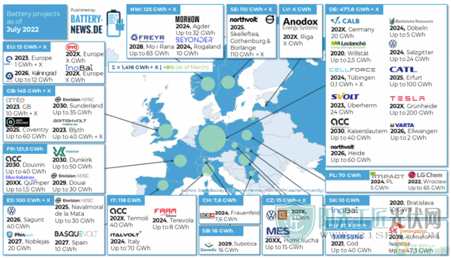 根據上游出版商Battery-News的數據,截至2022年7月,歐洲規劃了1416GWh鋰離子電池年度總產能(下圖顯示的是為該出版商制作的信息圖)。