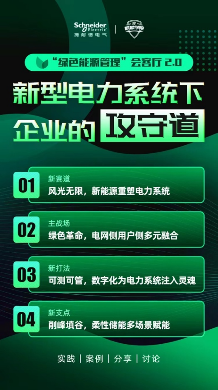 2022年“綠色能源管理”會客廳第二季,麒麟學院與施耐德電氣以新型電力系統下企業的“攻守”之道為主題,直面新型電力系統下的新趨勢、新變化,邀請業內資深專家圍繞四大課題——“新賽道-風光無限,新能源重塑電力系統”“主戰場 - 綠色革命,電網側用戶側多元融合”“新打法-可測可管,數字化為電力系統注入靈魂”“新支點–削峰填谷,柔性儲能多場景賦能”,展開深入探討與思考,幫助各類企業在能源管理的端到端實現安全可靠、高效管理,進而輕松的應對雙碳的挑戰。