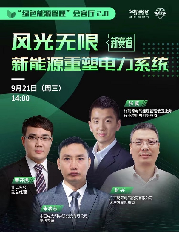 2022年9月21日,以“風(fēng)光無限 新能源重塑電力系統(tǒng)”為主題的“綠色能源管理”會(huì)客廳直播欄目在能見·麒麟學(xué)院舉行。本場(chǎng)直播由能見科技副總經(jīng)理曹開虎主持,匯聚中國(guó)電力科學(xué)研究院有限公司高級(jí)專家朱凌志、施耐德電氣能源管理低壓業(yè)務(wù)行業(yè)應(yīng)用與創(chuàng)新總監(jiān)張翼、廣東明陽(yáng)電氣股份有限公司客戶方案部總監(jiān)張興等業(yè)內(nèi)權(quán)威專家與企業(yè)伙伴,圍繞“新能源如何應(yīng)對(duì)大規(guī)模并網(wǎng)挑戰(zhàn)”“如何進(jìn)一步提升新能源智慧運(yùn)維能力”“海上風(fēng)電如何應(yīng)對(duì)大型化趨勢(shì)”“微電網(wǎng)革命對(duì)產(chǎn)業(yè)鏈構(gòu)成什么影響”等產(chǎn)業(yè)痛點(diǎn),探討新能源增長(zhǎng)趨勢(shì)下電力系統(tǒng)的發(fā)展方向與應(yīng)對(duì)之道。
