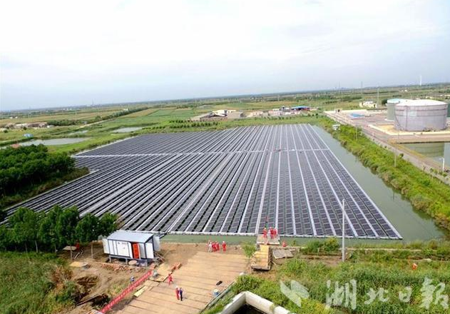 9月26日,中石化江漢油田首個漂浮式光伏發電項目——清河采油廠二號點光伏發電站,有序排列、整齊劃一的光伏板正源源不斷為油區生產生活提供綠色能源,促進油區綠色低碳發展。