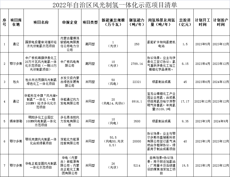 按照分類評估、客觀評價、科學(xué)評估的原則,從氫能需求、新能源規(guī)模配置、制氫方案、氫能利用等方面,評估優(yōu)選了示范項目7個(詳見附件),其中鄂爾多斯市3個、通遼市2個、包頭市1個、錫林郭勒盟1個,建設(shè)新能源168萬千瓦,其中風(fēng)電124萬千瓦、光伏44萬千瓦,電解水制氫6.3萬噸/年。