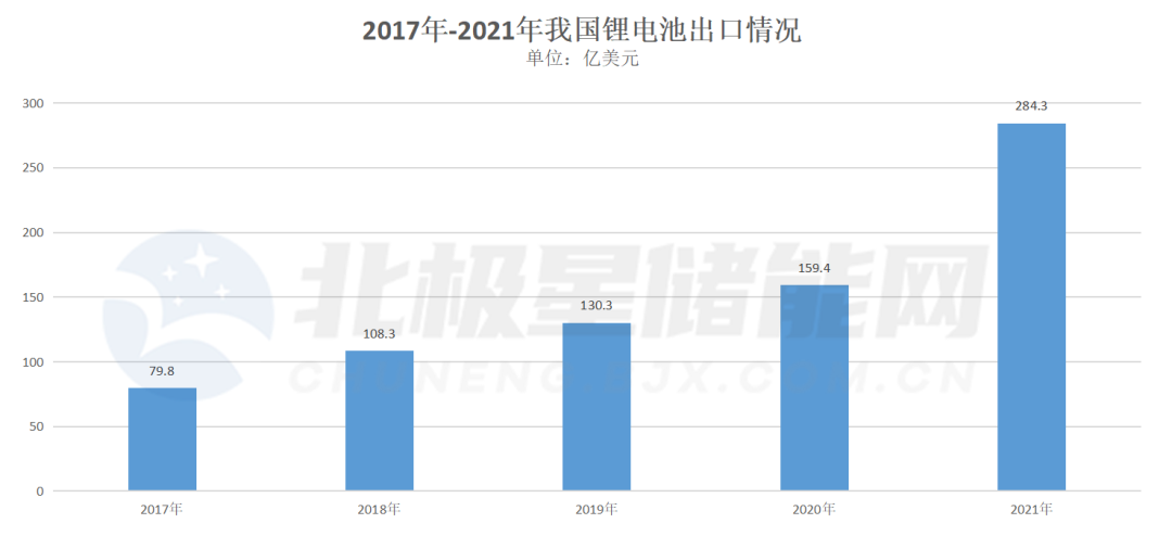 數(shù)據(jù)顯示,2015年,我國正式出口第一批鋰電池設(shè)備,現(xiàn)如今我國鋰電池設(shè)備的出口已經(jīng)覆蓋30多個(gè)國家和地區(qū)。2021年,我國儲(chǔ)能電池出貨量達(dá)48GWh、同比增長167%,預(yù)計(jì)2022年裝機(jī)量超90GWh,同比增長88%,2025年將超過324GWh。而海關(guān)統(tǒng)計(jì)顯示,2022年前8個(gè)月,我國鋰離子儲(chǔ)能電池累計(jì)出口299.26億美元,同比增長82.97%。北極星儲(chǔ)能網(wǎng)整理近年鋰離子電池出口情況如下,儲(chǔ)能鋰電池今年1-8月的出口額已經(jīng)超過2021年全年所有鋰電池出口額。