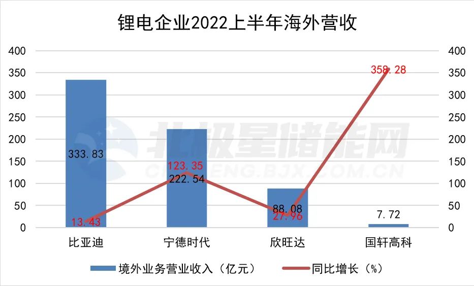 多家儲(chǔ)能企業(yè)信息顯示,近年來,中國儲(chǔ)能企業(yè)也在爭相布局海外儲(chǔ)能市場(chǎng)、加速儲(chǔ)能產(chǎn)品出海。2022年半年報(bào)顯示,作為我國鋰電池四大主要廠商,寧德時(shí)代、比亞迪、國軒高科、欣旺達(dá)境外收入實(shí)現(xiàn)不同程度的增長,其中寧德時(shí)代海外業(yè)務(wù)營收翻倍,國軒高科海外營收同比增長358.28%。