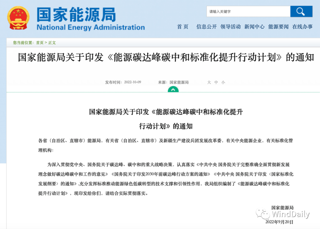 WindDaily獲悉,國家能源局10月9日發布《能源碳達峰碳中和標準化提升行動計劃》。文件指出:建立完善以光伏、風電為主的可再生能源標準體系,研究建立支撐新型電力系統建設的標準體系,加快完善新型儲能標準體系,有力支撐大型風電光伏基地、分布式能源等開發建設、并網運行和消納利用。加快完善風電、光伏等可再生能源標準。抓緊完善沙漠、戈壁、荒漠地區大型風電光伏基地建設有關技術標準,加快制定海上風電開發及多種能源綜合利用技術標準,推動分散式風電、分布式光伏、戶用光伏等就近開發利用相關標準制修訂,建立完善光伏發電、光熱發電標準體系。制定風電機組、光伏組件退役回收與再利用相關標準。具體如下: