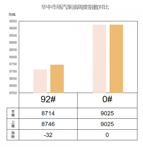 華中(湖南、湖北、江西、安徽) 成品油價格汽跌柴穩。本周92#汽油市場價格為8714元/噸,較上周下跌32元/噸,跌幅0.37%;0#柴油市場價格為9025元/噸,較上周上漲167元/噸,漲幅1.89%。目前來看,油價底部支撐得到持續加固,短期內大跌風險明顯減弱,或仍將在相對高位區間運行。