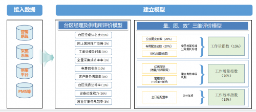 基于公司數據中臺與供電服務指揮系統平臺,在不新增設備、新增系統的情況下,通過打通平臺和專業壁壘,將供電服務指揮系統平臺作為各專業系統的統一入口,實現多方數據融合,形成統一數據資源池和工單池,提高供電所數據支撐和系統應用能力。通過直觀展示供電所業務及指標數據,建立可量化的績效排名及評價體系,量化了供電所員工日常工作量與工作質效,直觀展示工作薄弱環節,為管理人員提供決策依據和管理思路,從而提高管理水平。客戶回訪信息核對以前通過系統查詢身份證、手機號、客戶姓名等信息制表,核對一戶人工操作需要3分鐘,現在使用系統一鍵式導出功能,不到30秒就可實現個人信息的導出,有效地提升了工作效率。