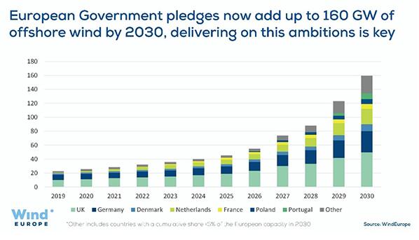 歐洲計劃到2030年達(dá)到160GW的海上風(fēng)電發(fā)展目標(biāo),屆時,英國仍將占據(jù)裝機(jī)量第一位