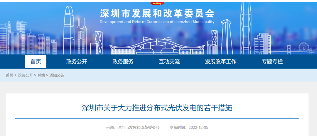 近日【光伏資訊】微信公眾號(PV-info)了解到,12月5日,深圳市發改委發布《深圳市關于大力推進分布式光伏發電的若干措施》,措施提出,充分利用工業園區、企業廠房、物流倉儲基地、公共建筑、交通設施和居民住宅等建筑物屋頂、外立面或其他適宜場地,按照“宜建盡建”原則積極開展光伏項目建設,大力推廣建筑光伏一體化(BIPV),力爭“十四五”期間全市新增光伏裝機容量150萬千瓦。重點推動工業園區規模化布局光伏項目,引導大型企業集團積極開展光伏項目建設,支持國有企業規模化建設光伏項目。
