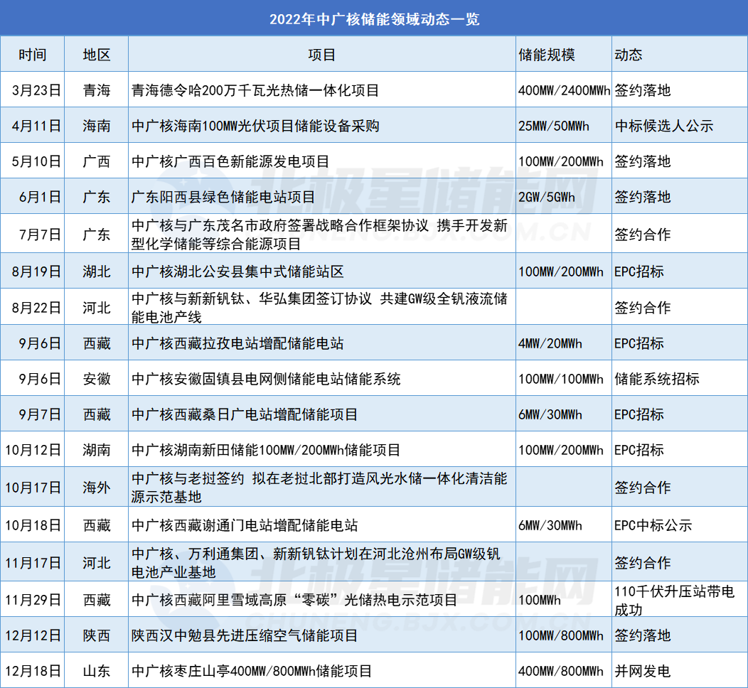 隨著儲能扶持政策出臺,除了風電光伏之外,中廣核新能源近年來加速布局儲能賽道。2022年,中廣核簽約、立項一大批儲能項目,總規模達到3.34GW/10.03GWh。