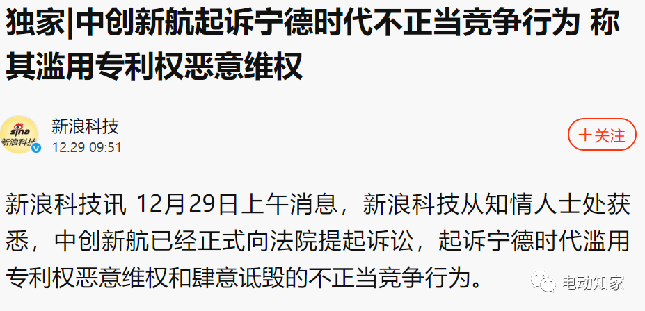 12月29日,據新浪科技報道,中創新航已經正式向法院提起訴訟,起訴寧德時代濫用專利權惡意維權和肆意詆毀的不正當競爭行為。