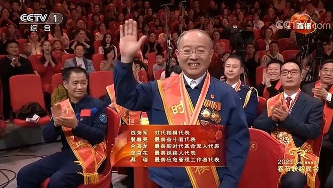 錢海軍身穿國家電網工裝,佩戴獎章,在主持人的介紹下起立亮相,與全國人民熱情打招呼拜年。春晚主持人表示:“不啻微芒、造炬成陽,在同心共筑中國夢的偉大征途中,留下自己閃亮的足跡,讓我們相信,追光的人,終將光芒萬丈!”