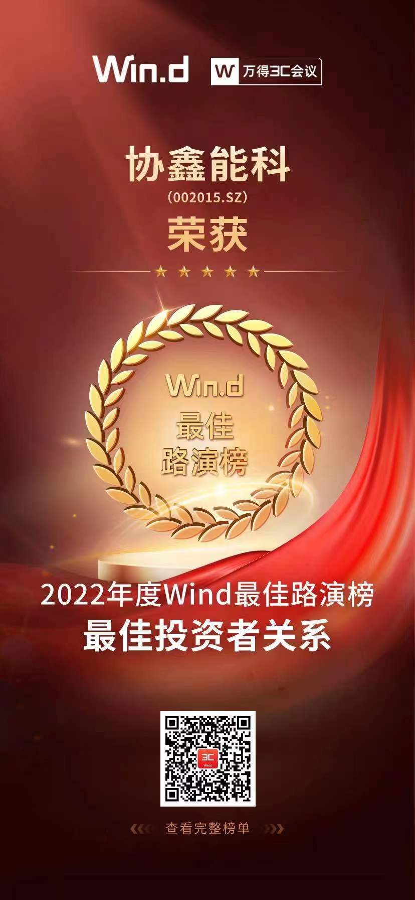 1月17日,由國內領先的金融數據和分析工具服務商萬得(Wind)主辦的2022年度Wind最佳路演榜揭曉。協鑫能科憑借近年來業績的穩健增長,投資者關系管理的專業水平,以及在資本市場影響力和美譽度的持續提升,榮獲“最佳投資者關系”獎。