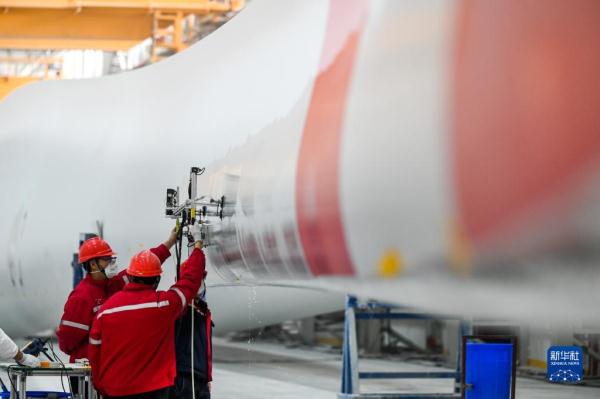 2月9日,在內蒙古烏蘭察布市遠景北方能源有限公司,質檢員在風機葉片生產線上工作。