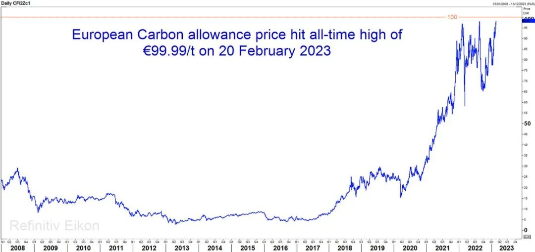 路透社報道, 2月20日歐洲基準碳排放合同創(chuàng)下歷史新高,2023年12月歐盟配額(EUA)基準合約收于每噸98.30歐元,自周五收盤以來上漲2.1%,此前曾觸及每噸99.99歐元的歷史新高。