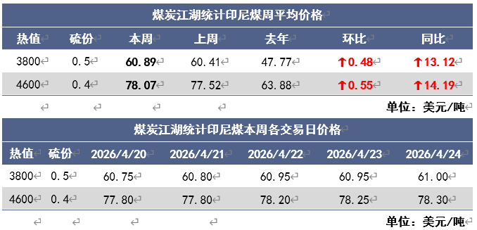 截至上周五,印尼煤3800卡報價為FOB61美元/噸,比上周上漲了0.6美元/噸;4600卡報價為FOB78.3美元/噸,比上周上漲了0.7美元/噸。印尼為保內需持續收緊出口配額,及中東地緣沖突推高燃油成本影響,外礦報價堅挺,印尼3800卡離岸報價較年初漲幅已超過30%。國內沿海終端電廠采購仍顯謹慎,多以剛需招標為主,市場實際成交冷清。