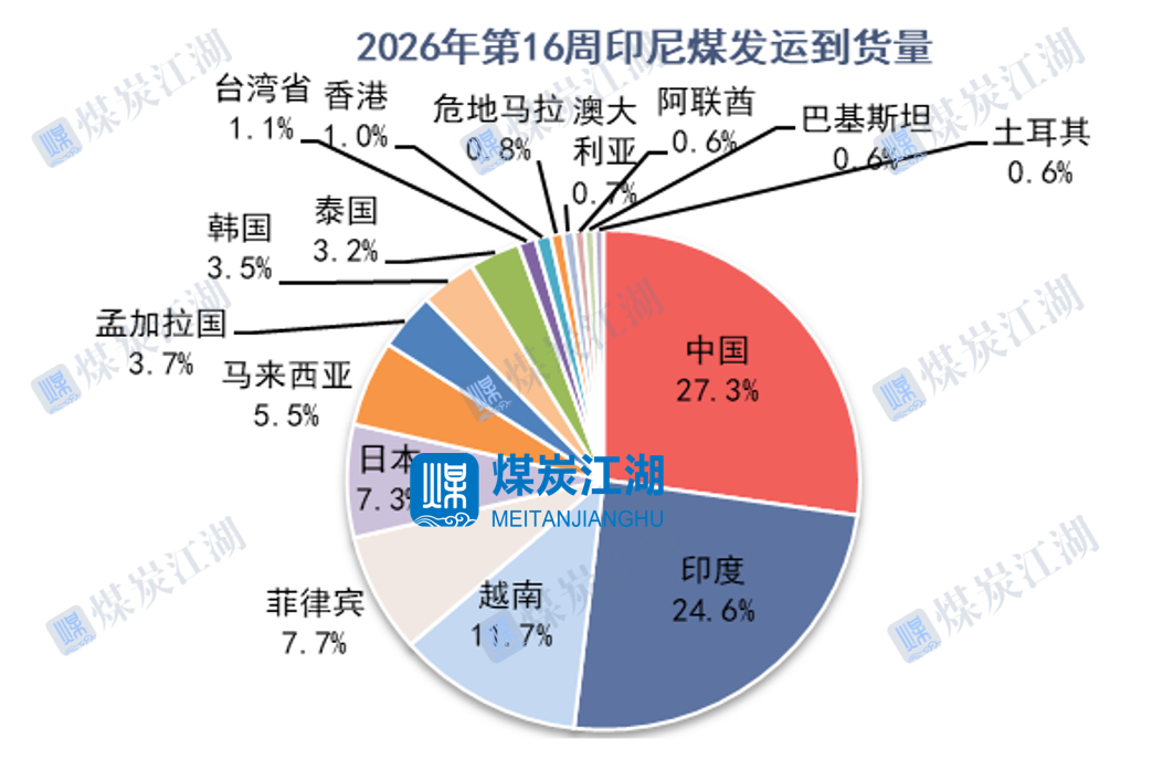 2026年第16周(4.13-4.19),世界各國進口印尼煤到貨量為720萬噸,合計118艘船。其中中國到貨量196萬噸、印度到貨量177萬噸、越南到貨量84萬噸、菲律賓到貨量55.5萬噸。
